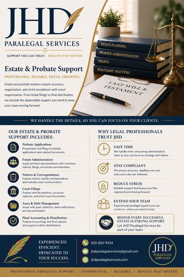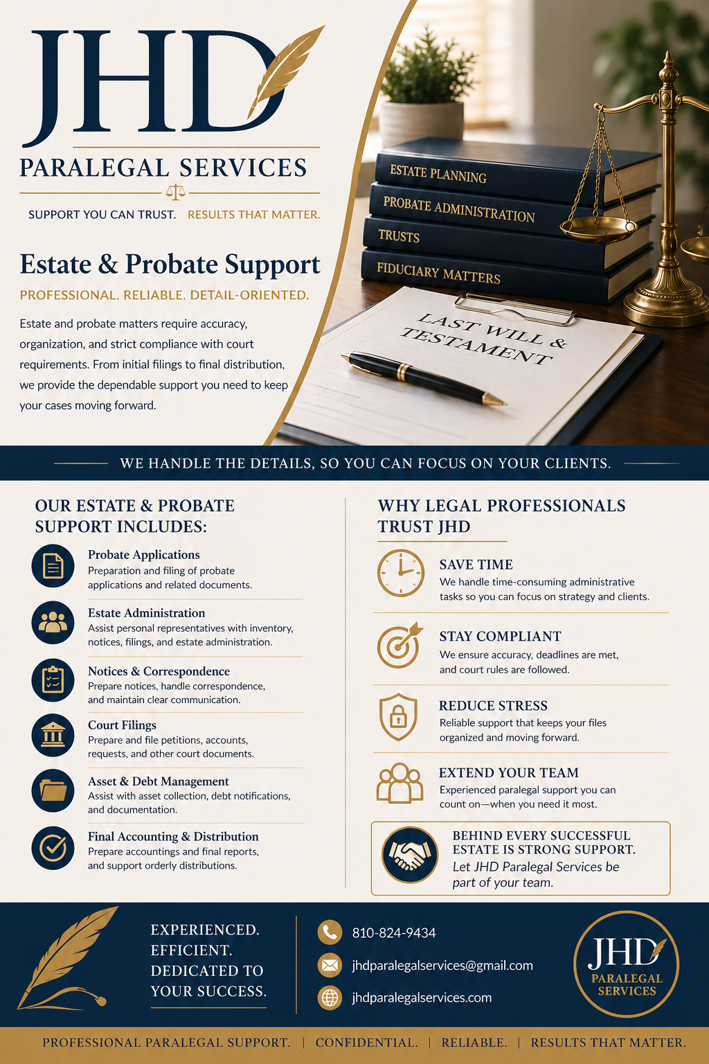 Legal Disclaimer: JHD Paralegal Services is not a law firm and does not provide legal advice or representation. Services are provided only under the direct supervision of a licensed attorney, in accordance with applicable laws and regulations. JHD Paralegal Services cannot and will not offer legal opinions or act as legal counsel to the public.